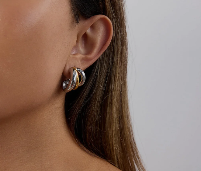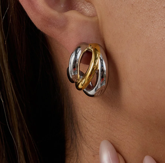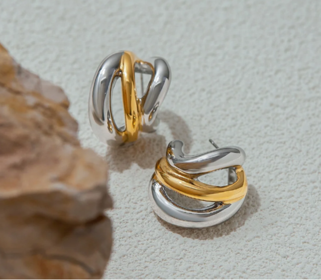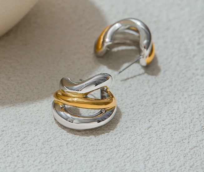 Modern and versatile, these half hoop earrings feature a bold geometric design in a chic two-tone finish. Crafted from durable stainless steel and plated with 18K gold, they’re built to last—completely waterproof and non-tarnish for effortless wear. The mix of gold and silver tones makes them easy to style with any outfit, from casual looks to elevated evenings. Lightweight yet striking, they’re the perfect statement piece for everyday elegance.