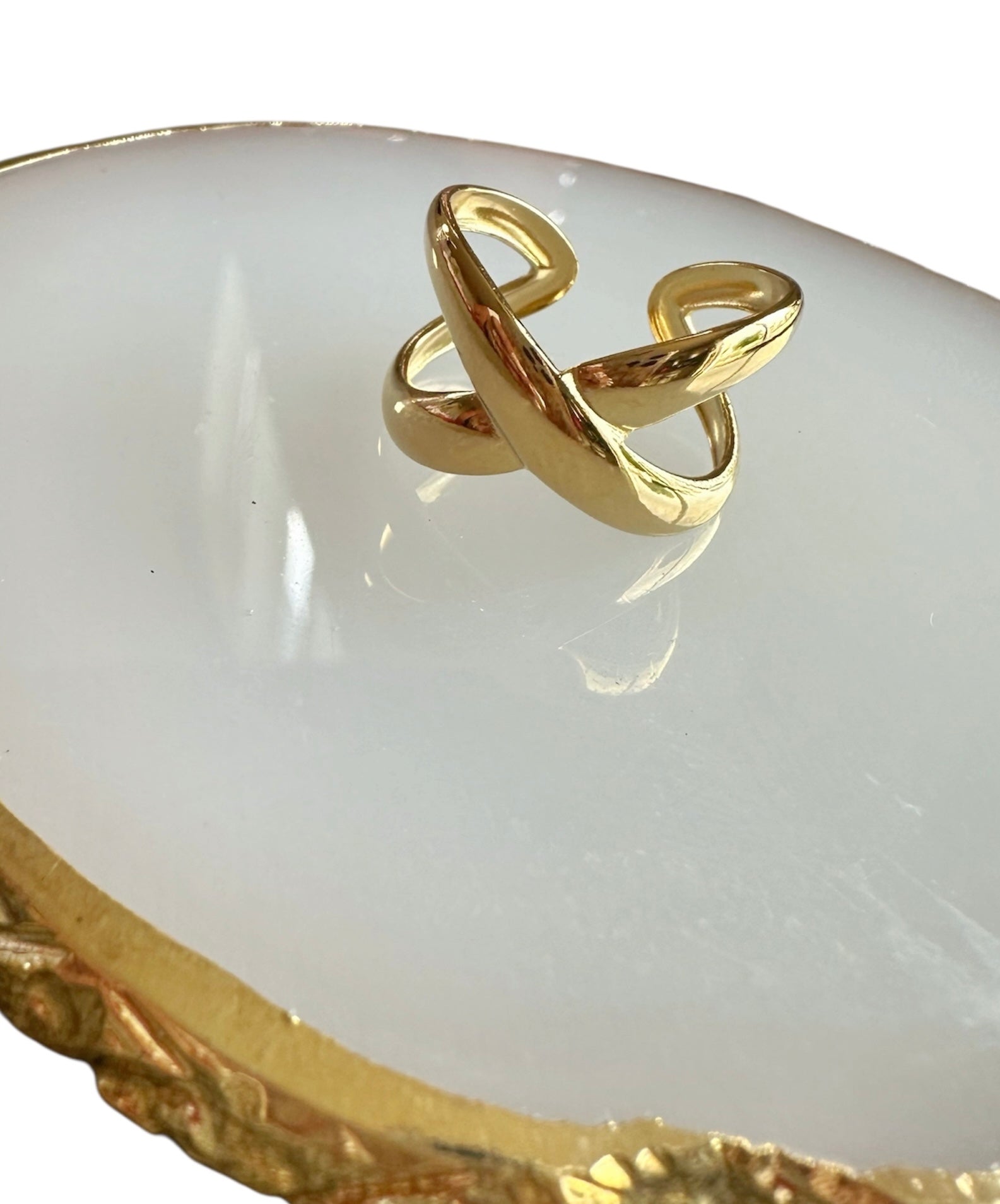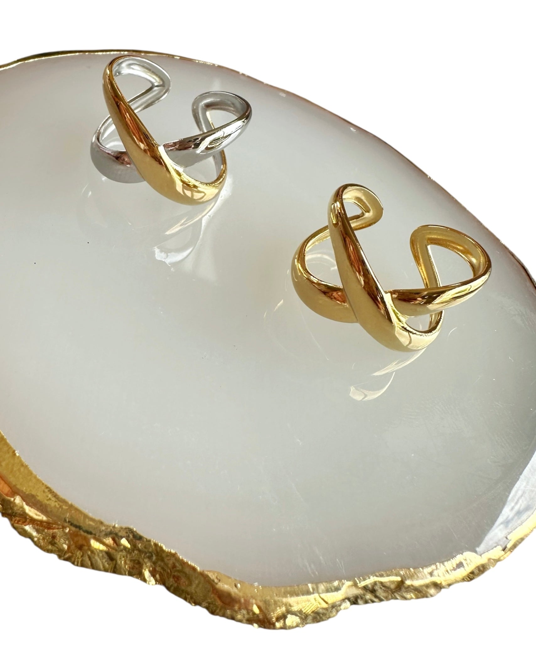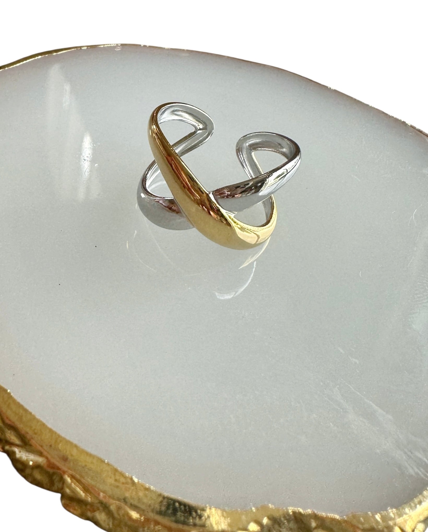 Elevate your style with this sleek and modern open band ring. Crafted from durable stainless steel and plated in luxurious 18k gold, it features a fluid, sculptural design that wraps elegantly around your finger. Available in classic gold or an eye-catching two-tone finish, this ring blends minimalist sophistication with a bold statement—perfect for stacking or wearing solo. Adjustable fit for versatile wear.