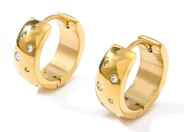 Add a touch of sparkle to your everyday style with these elegant gold huggies. Adorned with small zircon jewels, they’re the perfect balance of subtle shine and timeless charm—easy to dress up or down. Crafted from stainless steel and plated in 18K gold, they’re completely waterproof and tarnish-free, ensuring lasting beauty and durability. Lightweight and comfortable, these huggies are designed for effortless elegance from day to night.
