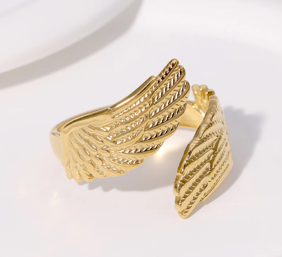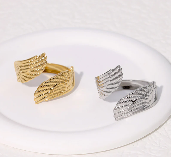 Make a bold, modern statement with this wing-inspired open ring, crafted from durable stainless steel and finished with sleek electroplating. Its adjustable design ensures a comfortable fit, while the expressive wing motif adds a sense of freedom and edge to any outfit. Waterproof & Non-Tarnish – designed to keep its shine through everyday wear. Modern & Symbolic Style – perfect for layering or wearing solo as a statement piece. Lightweight, durable, and effortlessly chic—a must-have for contemporary jewelry lovers.