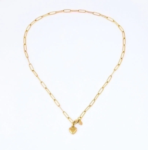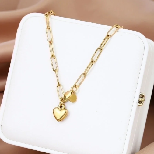Handmade with love, this heart-shaped pendant necklace captures the essence of romance and elegance. Crafted from durable stainless steel and finished with a radiant 18K gold plating, it hangs gracefully on a classic chain, perfectly sized at 17 inches for a timeless, feminine look. Waterproof & Non-Tarnish – built to last while keeping its shine. Romantic & Minimalist Design – a versatile piece for both everyday wear and special moments. A meaningful necklace that adds warmth and charm to any outfit.