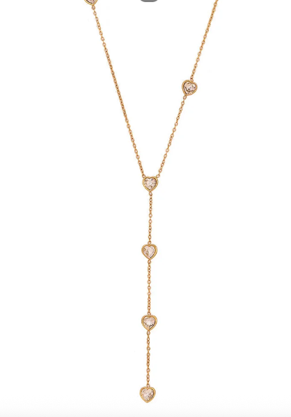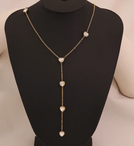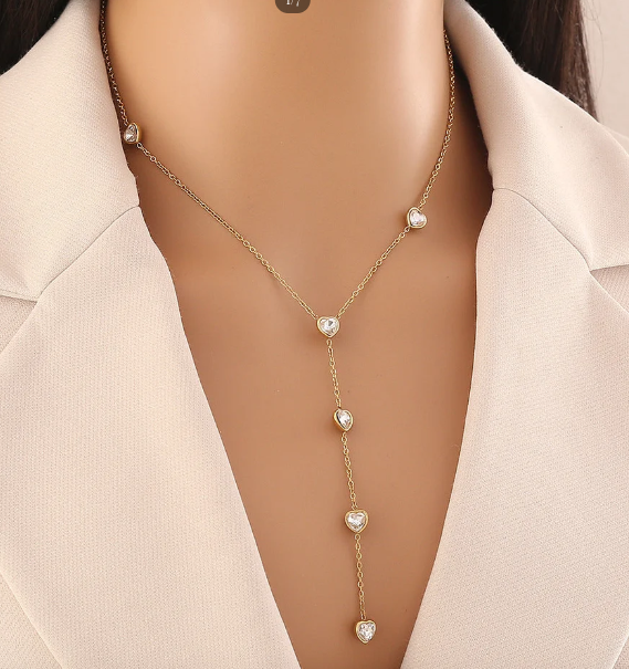 Chic and versatile, this gold glass heart necklace is the perfect blend of elegance and modern style. Designed in a fashionable Y-shape, the pendant rests beautifully along the collarbone for a flattering look. Crafted from durable stainless steel and plated with 18K gold, it’s waterproof and tarnish-free—made to shine with everyday wear. Whether styled alone for a minimal touch or layered with other pieces, this necklace adds effortless elegance to any outfit.